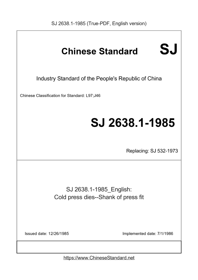 Delivery: <= 2 days. True-PDF full-copy in English will be manually translated and delivered via email. SJ 2638.1-1985: Cold press dies--Shank of press fit Status: Obsolete