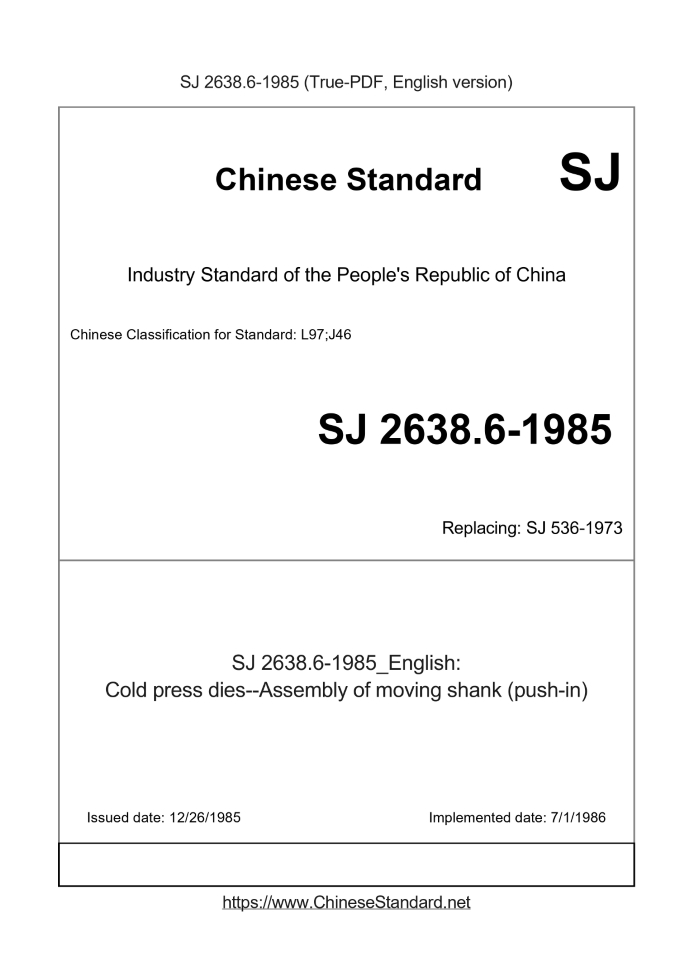 Delivery: <= 2 days. True-PDF full-copy in English will be manually translated and delivered via email. SJ 2638.6-1985: Cold press dies--Assembly of moving shank (push-in) Status: Obsolete SJ 2638.6: Historical versions