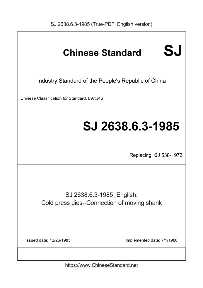 Delivery: <= 2 days. True-PDF full-copy in English will be manually translated and delivered via email. SJ 2638.6.3-1985: Cold press dies--Connection of moving shank Status: Obsolete