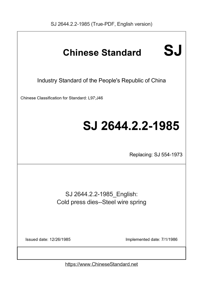 Delivery: <= 2 days. True-PDF full-copy in English will be manually translated and delivered via email. SJ 2644.2.2-1985: Cold press dies--Steel wire spring Status: Obsolete