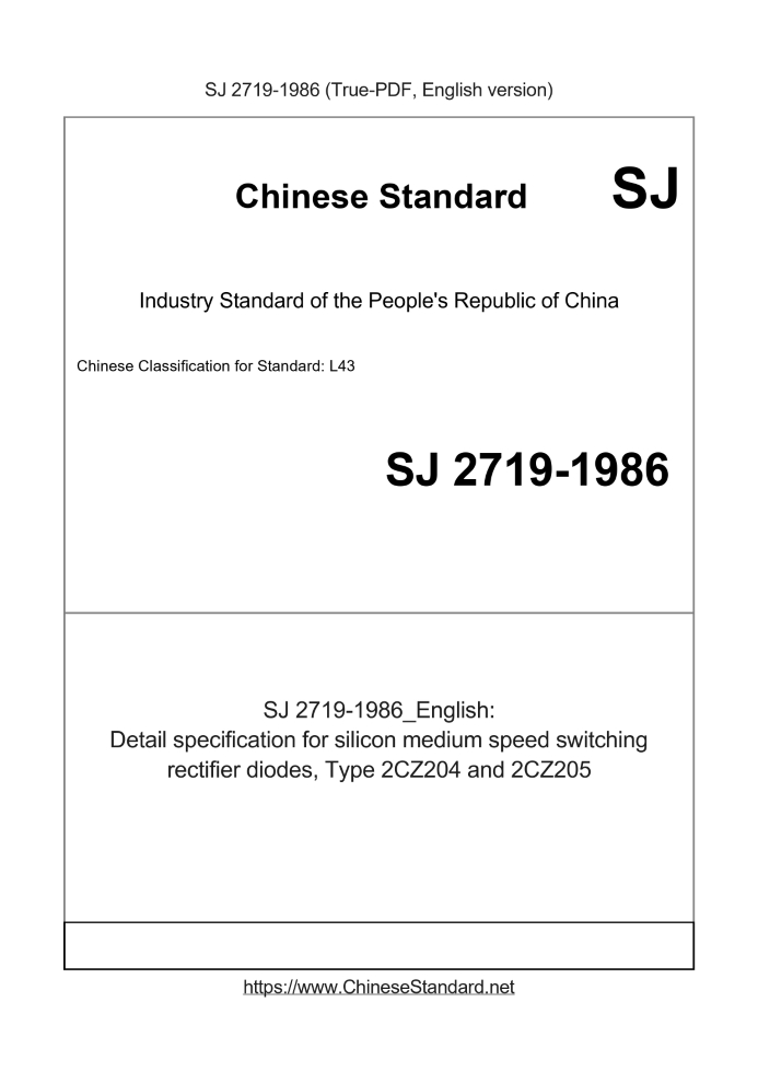 Delivery: <= 3 days. True-PDF full-copy in English will be manually translated and delivered via email. SJ 2719-1986: Detail specification for silicon medium speed switching rectifier diodes, Type 2CZ204 and 2CZ205 Status: Obsolete