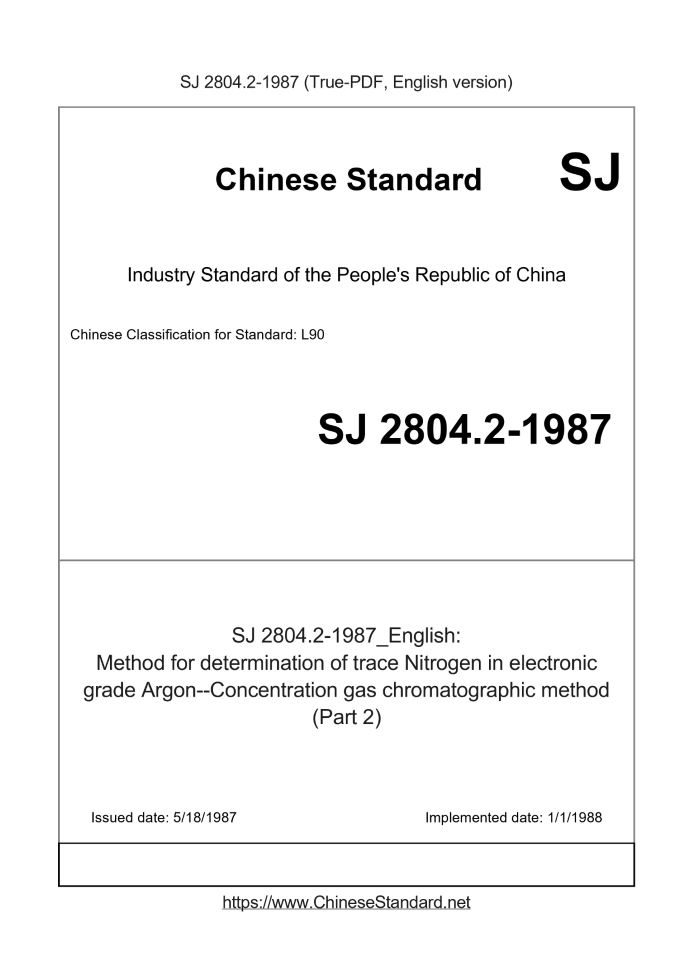 Delivery: <= 2 days. True-PDF full-copy in English will be manually translated and delivered via email. SJ 2804.2-1987: Method for determination of trace Nitrogen in electronic grade Argon--Concentration gas chromatographic method (Part 2) Status: Obsolete
