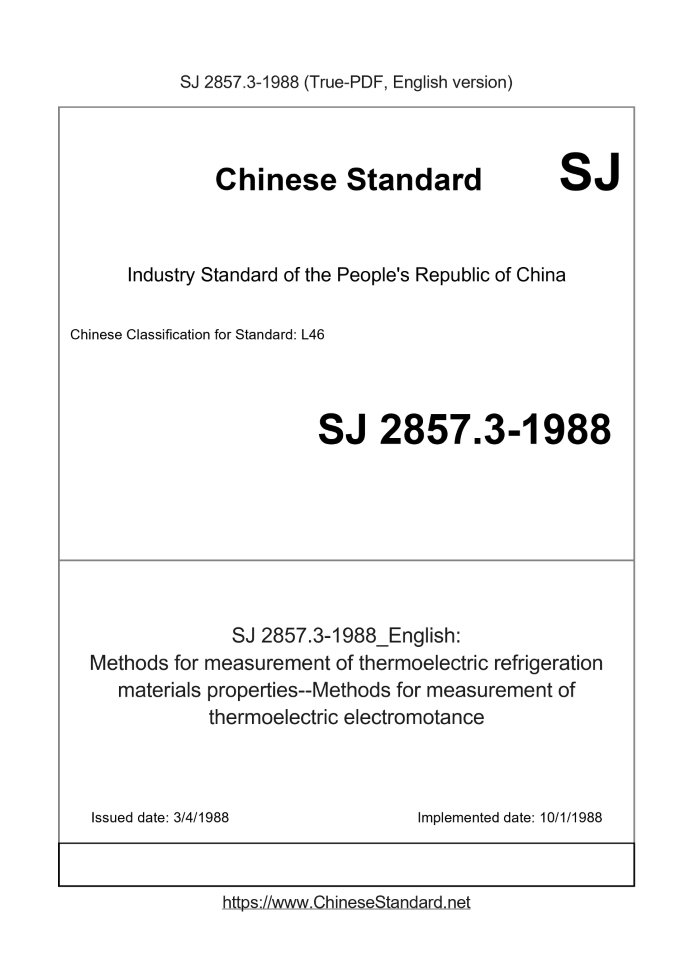 Delivery: <= 2 days. True-PDF full-copy in English will be manually translated and delivered via email. SJ 2857.3-1988: Methods for measurement of thermoelectric refrigeration materials properties--Methods for measurement of thermoelectric electromotance
