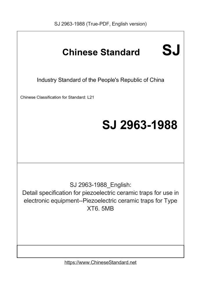 Delivery: <= 3 days. True-PDF full-copy in English will be manually translated and delivered via email. SJ 2963-1988: Detail specification for piezoelectric ceramic traps for use in electronic equipment--Piezoelectric ceramic traps for Type XT6. 5MB Status: Obsolete