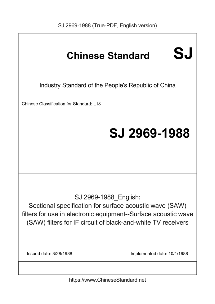 Delivery: <= 6 days. True-PDF full-copy in English will be manually translated and delivered via email. SJ 2969-1988: Sectional specification for surface acoustic wave (SAW) filters for use in electronic equipment--Surface acoustic wave (SAW) filters for IF circuit of black-and-white TV receivers Status: Obsolete