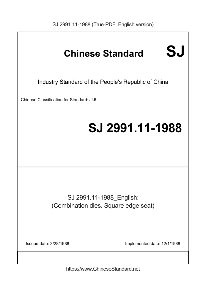 Delivery: <= 2 days. True-PDF full-copy in English will be manually translated and delivered via email. SJ 2991.11-1988: (Combination dies. Square edge seat) Status: Obsolete