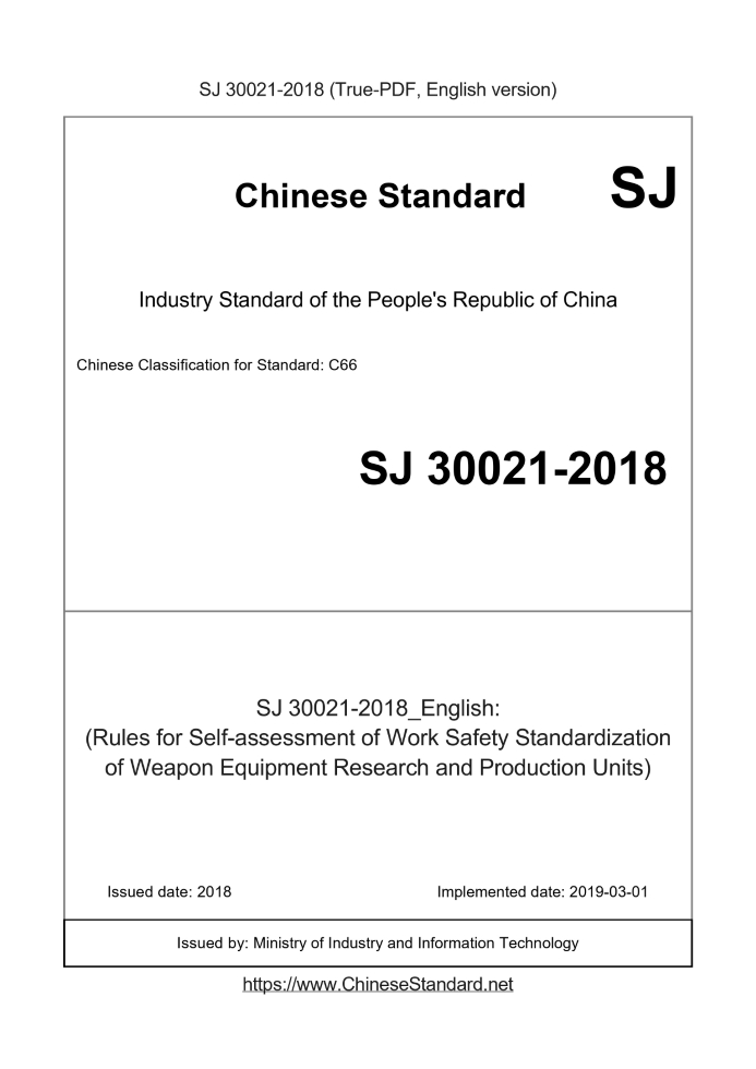 Delivery: <= 4 days. True-PDF full-copy in English will be manually translated and delivered via email. SJ 30021-2018: (Rules for Self-assessment of Work Safety Standardization of Weapon Equipment Research and Production Units)