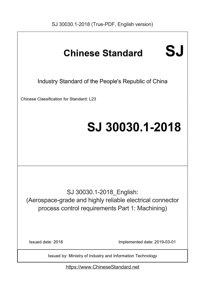 Delivery: <= 4 days. True-PDF full-copy in English will be manually translated and delivered via email. SJ 30030.1-2018: (Aerospace-grade and highly reliable electrical connector process control requirements Part 1: Machining)