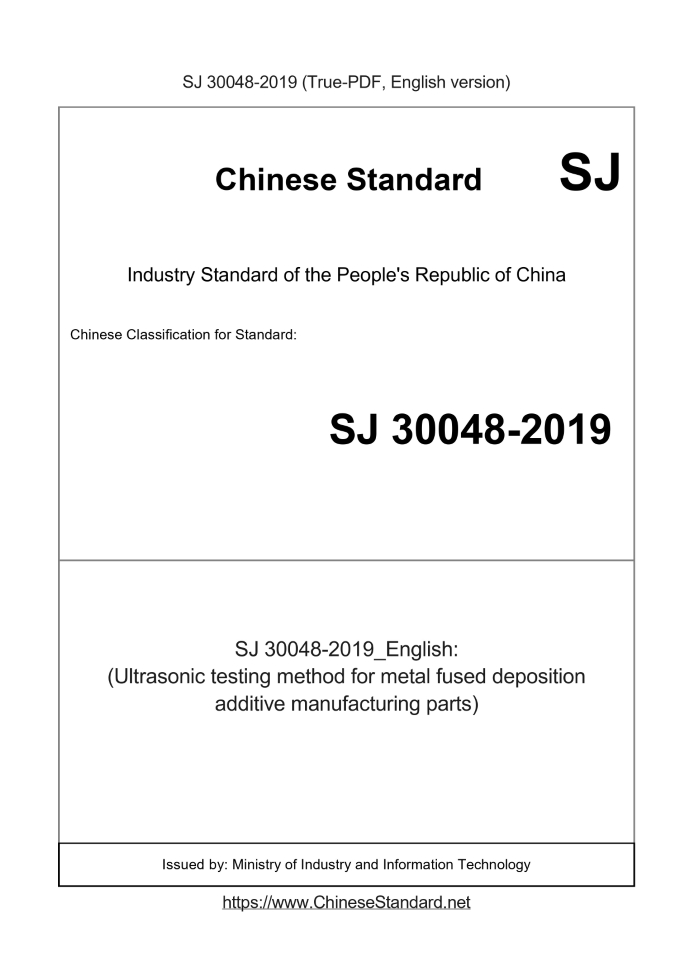 Delivery: <= 3 days. True-PDF full-copy in English will be manually translated and delivered via email. SJ 30048-2019: (Ultrasonic testing method for metal fused deposition additive manufacturing parts) Status: Valid