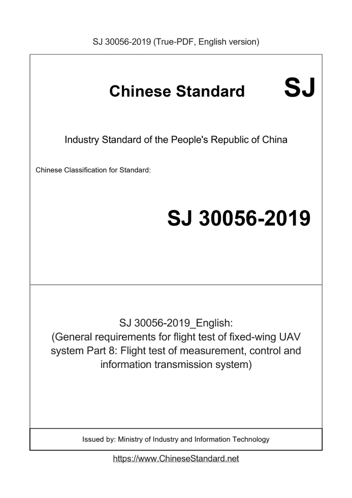 Delivery: <= 3 days. True-PDF full-copy in English will be manually translated and delivered via email. SJ 30056-2019: (General requirements for flight test of fixed-wing UAV system Part 8: Flight test of measurement, control and information transmission system) Status: Valid