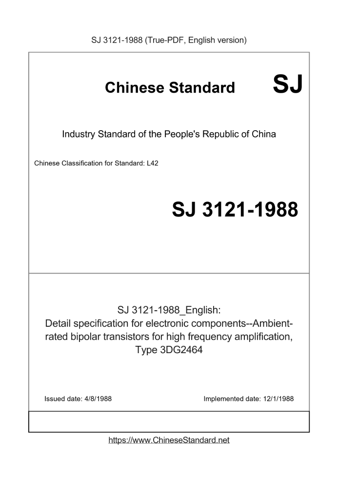 Delivery: <= 3 days. True-PDF full-copy in English will be manually translated and delivered via email. SJ 3121-1988: Detail specification for electronic components--Ambient-rated bipolar transistors for high frequency amplification, Type 3DG2464 Status: Obsolete