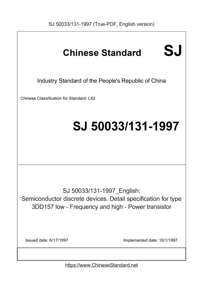 Delivery: <= 3 days. True-PDF full-copy in English will be manually translated and delivered via email. SJ 50033131-1997: Semiconductor discrete devices. Detail specification for type 3DD157 low - Frequency and high - Power transistor