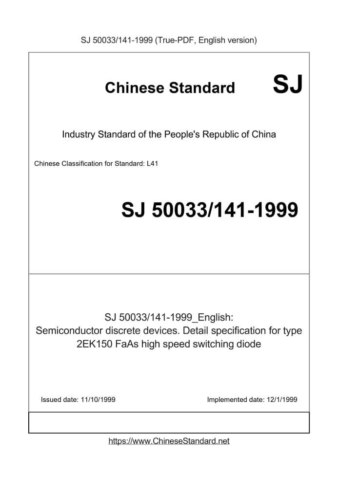 Delivery: <= 3 days. True-PDF full-copy in English will be manually translated and delivered via email. SJ 50033141-1999: Semiconductor discrete devices. Detail specification for type 2EK150 FaAs high speed switching diode