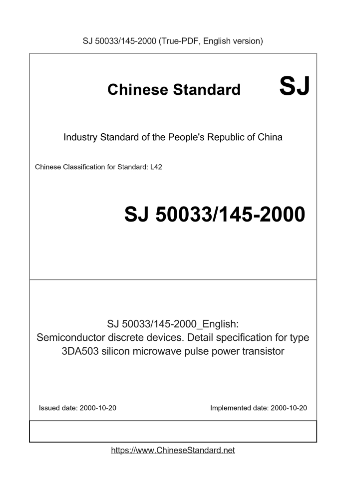 | SJ 50033/145-2000 | English | 389 | Add to Cart | 3 days [Need to translate] | Semiconductor discrete devices. Detail specification for type 3DA503 silicon microwave pulse power transistor |
