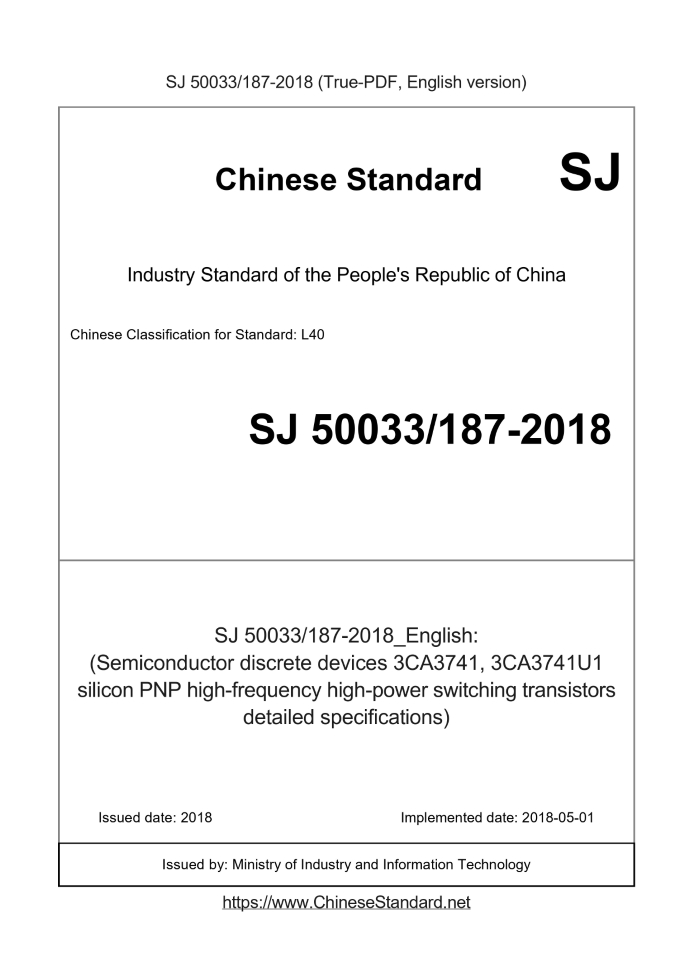 Delivery: <= 5 days. True-PDF full-copy in English will be manually translated and delivered via email. SJ 50033187-2018: (Semiconductor discrete devices 3CA3741, 3CA3741U1 silicon PNP high-frequency high-power switching transistors detailed specifications)