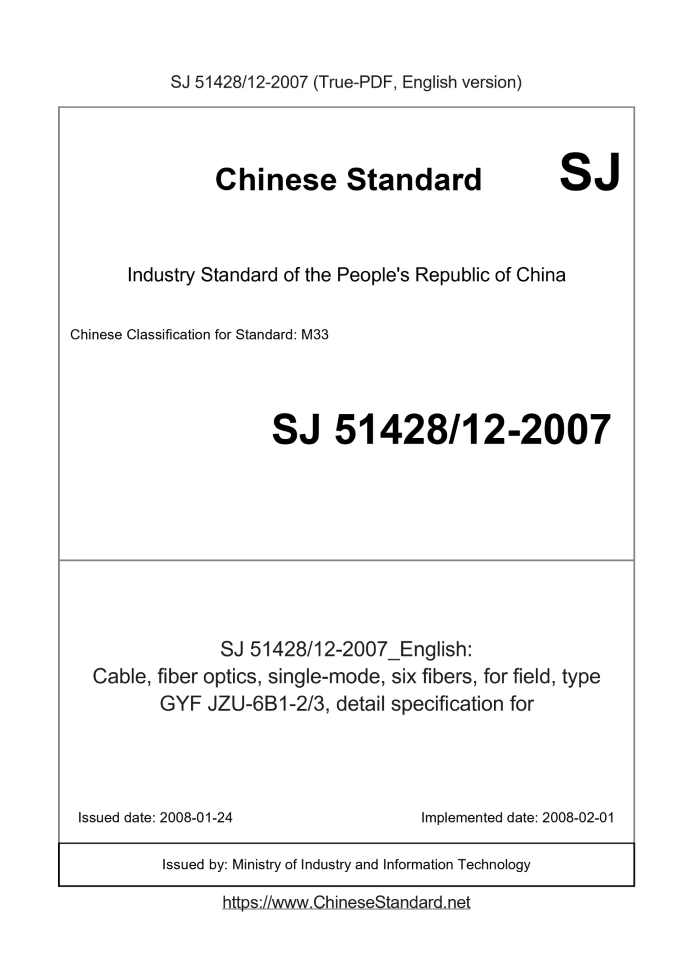 | SJ 51428/12-2007 | English | 389 | Add to Cart | 3 days [Need to translate] | Cable, fiber optics, single-mode, six fibers, for field, type GYF JZU-6B1-2/3, detail specification for |