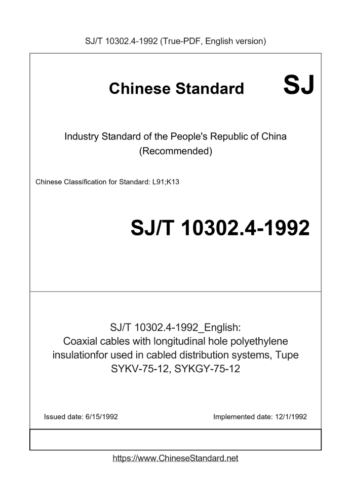 Delivery: <= 3 days. True-PDF full-copy in English will be manually translated and delivered via email. SJ/T 10302.4-1992: Coaxial cables with longitudinal hole polyethylene insulationfor used in cabled distribution systems, Tupe SYKV-75-12, SYKGY-75-12 Status: Obsolete