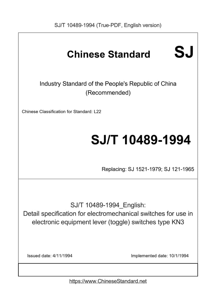 | SJ/T 10489-1994 English PDFUS$319.00 ยท In stock Delivery: <= 3 days. True-PDF full-copy in English will be manually translated and delivered via email. SJ/T 10489-1994: Detail specification for electromechanical switches for use in electronic equipment lever (toggle) switches type KN3