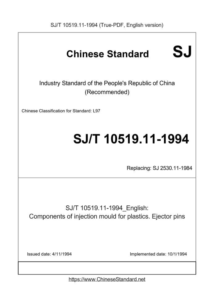 | SJ/T 10519.11-1994 English PDFUS$199.00 ยท In stock Delivery: <= 2 days. True-PDF full-copy in English will be manually translated and delivered via email. SJ/T 10519.11-1994: Components of injection mould for plastics. Ejector pins Status: Obsolete