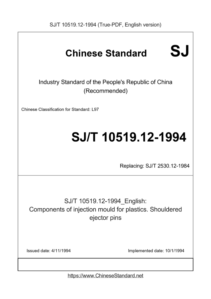 | SJ/T 10519.12-1994 English PDFUS$179.00 ยท In stock Delivery: <= 2 days. True-PDF full-copy in English will be manually translated and delivered via email. SJ/T 10519.12-1994: Components of injection mould for plastics. Shouldered ejector pins Status: Obsolete