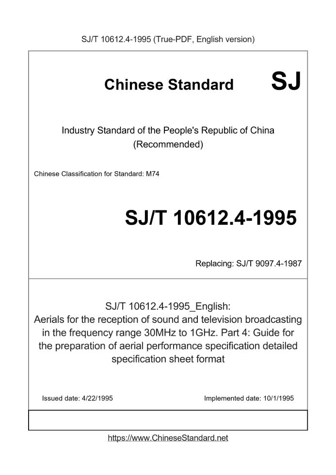Delivery: <= 3 days. True-PDF full-copy in English will be manually translated and delivered via email. SJ/T 10612.4-1995: Aerials for the reception of sound and television broadcasting in the frequency range 30MHz to 1GHz. Part 4: Guide for the preparation of aerial performance specification detailed specification sheet format