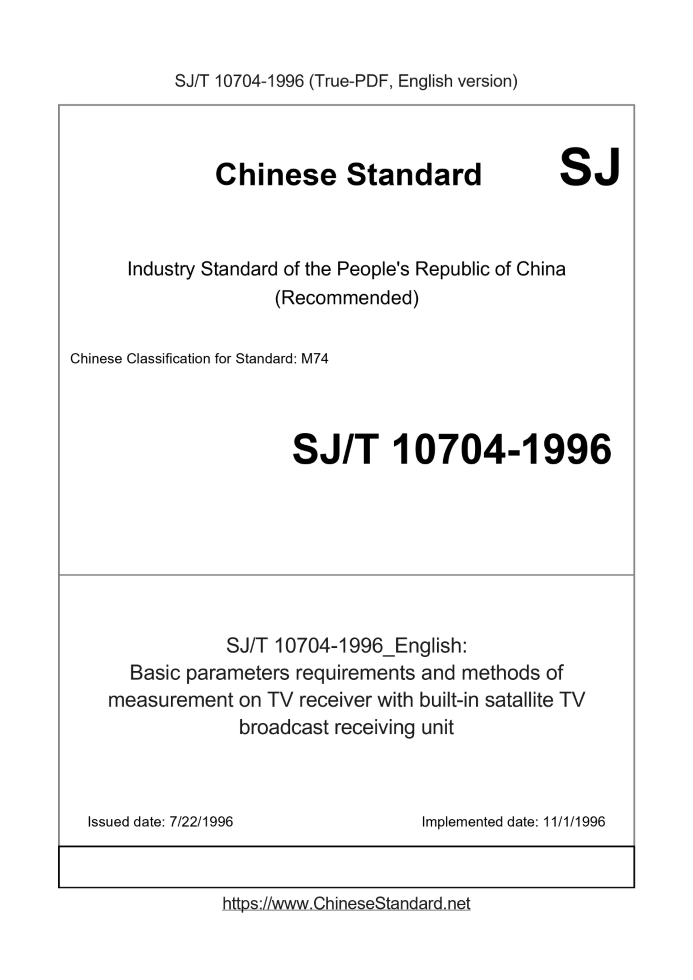 Delivery: <= 5 days. True-PDF full-copy in English will be manually translated and delivered via email. SJ/T 10704-1996: Basic parameters requirements and methods of measurement on TV receiver with built-in satallite TV broadcast receiving unit Status: Obsolete