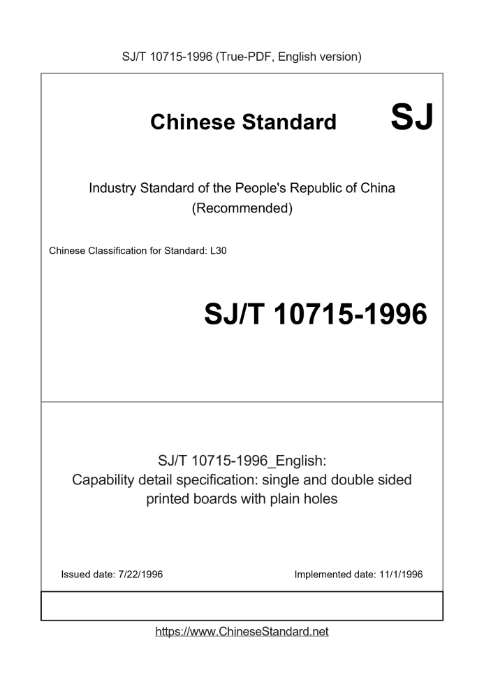 Delivery: <= 3 days. True-PDF full-copy in English will be manually translated and delivered via email. SJ/T 10715-1996: Capability detail specification: single and double sided printed boards with plain holes Status: Obsolete
