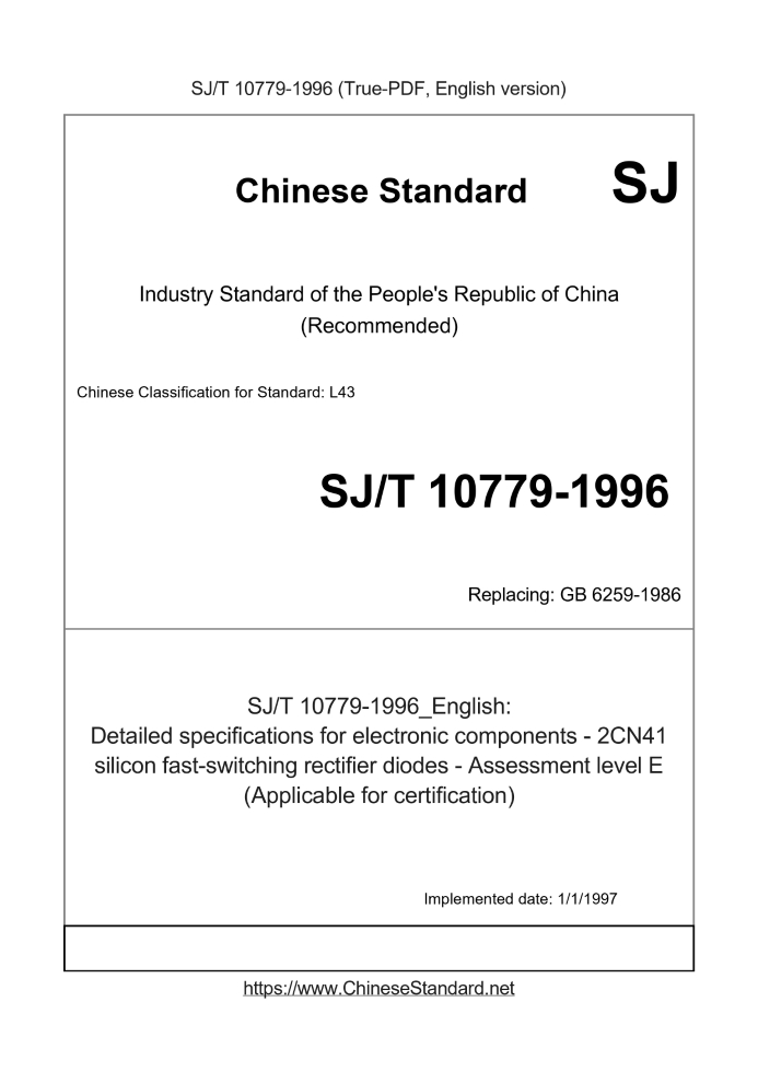 Delivery: <= 4 days. True-PDF full-copy in English will be manually translated and delivered via email. SJ/T 10779-1996: Detailed specifications for electronic components - 2CN41 silicon fast-switching rectifier diodes - Assessment level E (Applicable for certification) Status: Obsolete