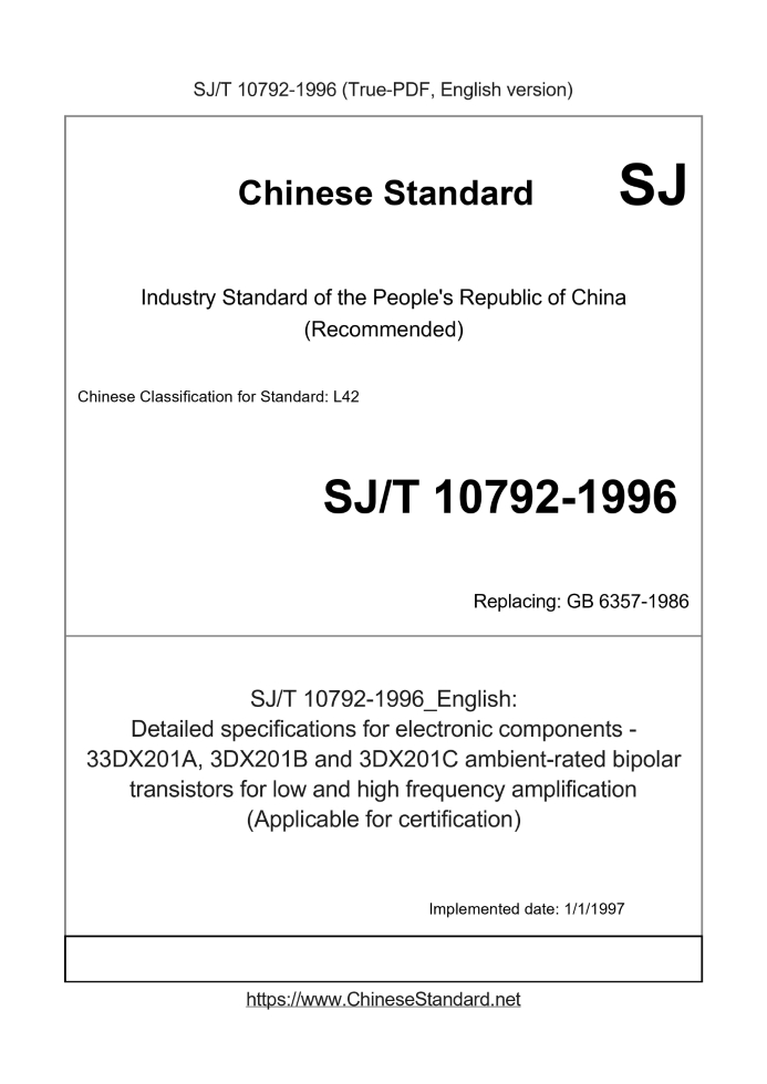 Delivery: <= 4 days. True-PDF full-copy in English will be manually translated and delivered via email. SJ/T 10792-1996: Detailed specifications for electronic components - 33DX201A, 3DX201B and 3DX201C ambient-rated bipolar transistors for low and high frequency amplification (Applicable for certification) Status: Obsolete