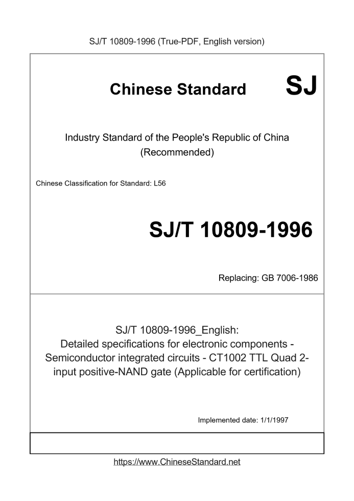Delivery: <= 5 days. True-PDF full-copy in English will be manually translated and delivered via email. SJ/T 10809-1996: Detailed specifications for electronic components - Semiconductor integrated circuits - CT1002 TTL Quad 2-input positive-NAND gate (Applicable for certification) Status: Obsolete