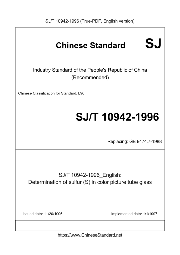 Delivery: <= 2 days. True-PDF full-copy in English will be manually translated and delivered via email. SJ/T 10942-1996: Determination of sulfur (S) in color picture tube glass