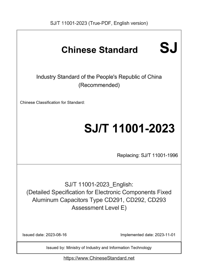 Delivery: <= 4 days. True-PDF full-copy in English will be manually translated and delivered via email. SJ/T 11001-2023: (Detailed Specification for Electronic Components Fixed Aluminum Capacitors Type CD291, CD292, CD293 Assessment Level E) Status: Valid SJ/T 11001: Historical versions