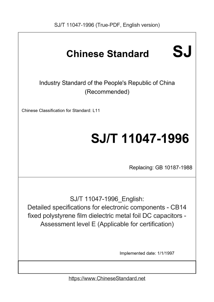 Delivery: <= 3 days. True-PDF full-copy in English will be manually translated and delivered via email. SJ/T 11047-1996: Detailed specifications for electronic components - CB14 fixed polystyrene film dielectric metal foil DC capacitors - Assessment level E (Applicable for certification) Status: Obsolete