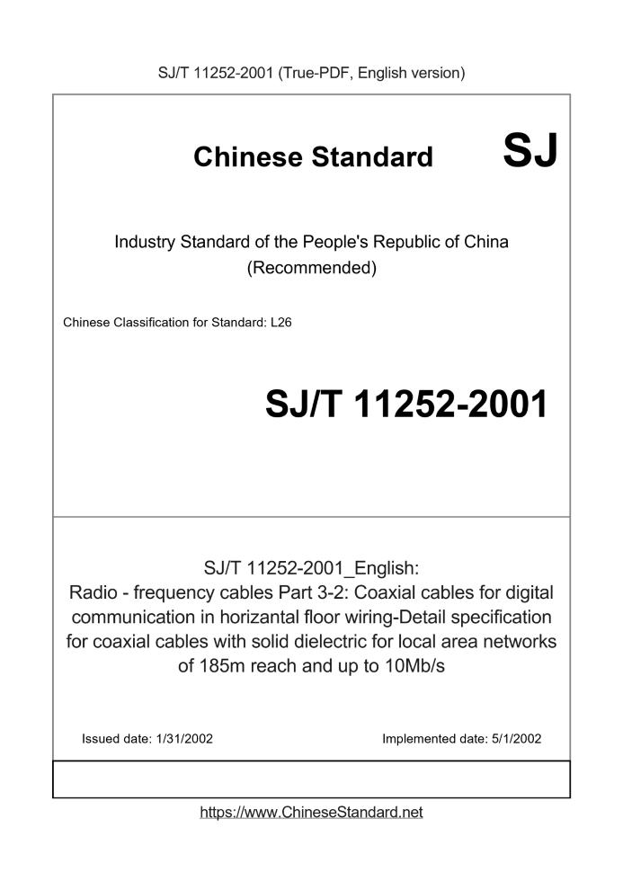 Delivery: <= 3 days. True-PDF full-copy in English will be manually translated and delivered via email. SJ/T 11252-2001: Radio - frequency cables Part 3-2: Coaxial cables for digital communication in horizantal floor wiring-Detail specification for coaxial cables with solid dielectric for local area networks of 185m reach and up to 10Mb/s Status: Obsolete
