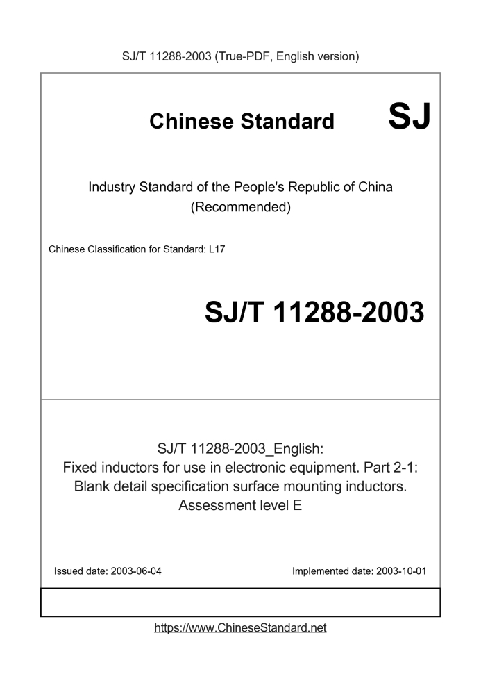 Delivery: <= 3 days. True-PDF full-copy in English will be manually translated and delivered via email. SJ/T 11288-2003: Fixed inductors for use in electronic equipment. Part 2-1: Blank detail specification surface mounting inductors. Assessment level E Status: Valid
