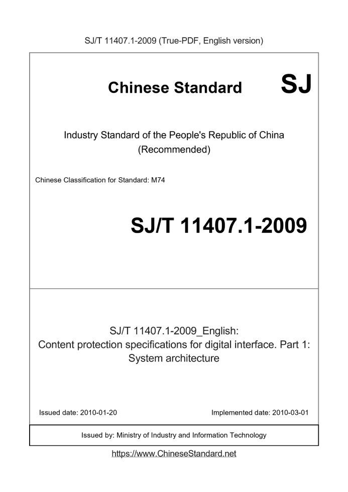 Delivery: <= 7 days. True-PDF full-copy in English will be manually translated and delivered via email. SJ/T 11407.1-2009: Content protection specifications for digital interface. Part 1: System architecture Status: Valid