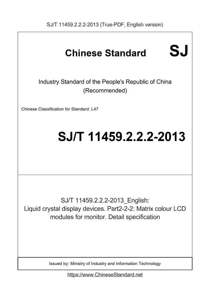 Delivery: <= 4 days. True-PDF full-copy in English will be manually translated and delivered via email. SJ/T 11459.2.2.2-2013: Liquid crystal display devices. Part2-2-2: Matrix colour LCD modules for monitor. Detail specification Status: Valid