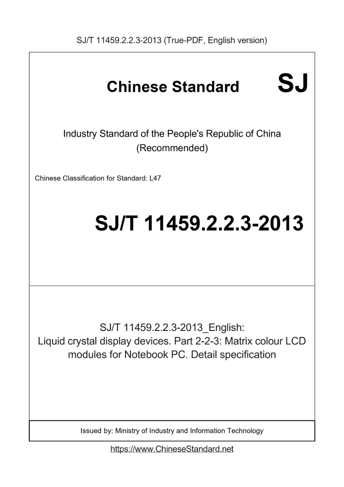 Delivery: <= 4 days. True-PDF full-copy in English will be manually translated and delivered via email. SJ/T 11459.2.2.3-2013: Liquid crystal display devices. Part 2-2-3: Matrix colour LCD modules for Notebook PC. Detail specification Status: Valid