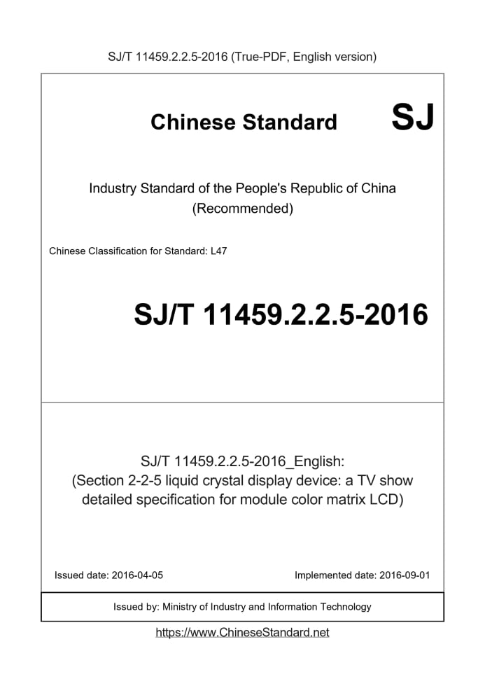 Delivery: <= 4 days. True-PDF full-copy in English will be manually translated and delivered via email. SJ/T 11459.2.2.5-2016: (Section 2-2-5 liquid crystal display device: a TV show detailed specification for module color matrix LCD) Status: Valid