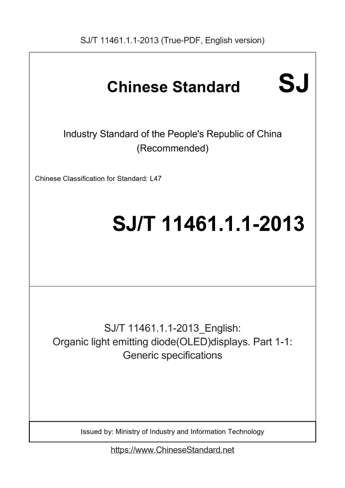 Delivery: <= 3 days. True-PDF full-copy in English will be manually translated and delivered via email. SJ/T 11461.1.1-2013: Organic light emitting diode(OLED)displays. Part 1-1: Generic specifications Status: Valid