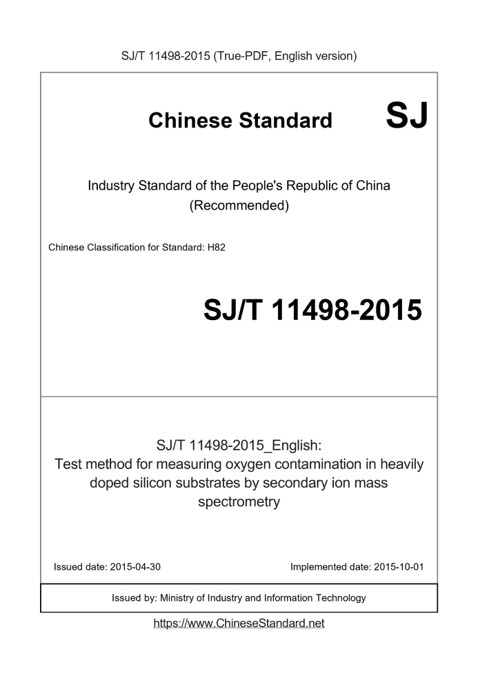 Delivery: <= 3 days. True-PDF full-copy in English will be manually translated and delivered via email. SJ/T 11498-2015: Test method for measuring oxygen contamination in heavily doped silicon substrates by secondary ion mass spectrometry Status: Valid