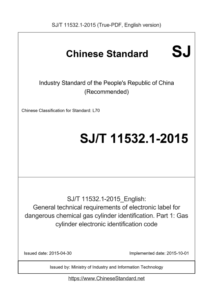 Delivery: <= 3 days. True-PDF full-copy in English will be manually translated and delivered via email. SJ/T 11532.1-2015: General technical requirements of electronic label for dangerous chemical gas cylinder identification. Part 1: Gas cylinder electronic identification code Status: Valid