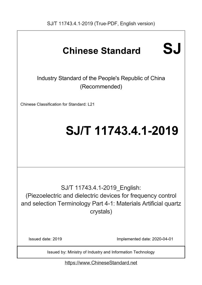 Delivery: <= 3 days. True-PDF full-copy in English will be manually translated and delivered via email. SJ/T 11743.4.1-2019: (Piezoelectric and dielectric devices for frequency control and selection Terminology Part 4-1: Materials Artificial quartz crystals) Status: Valid