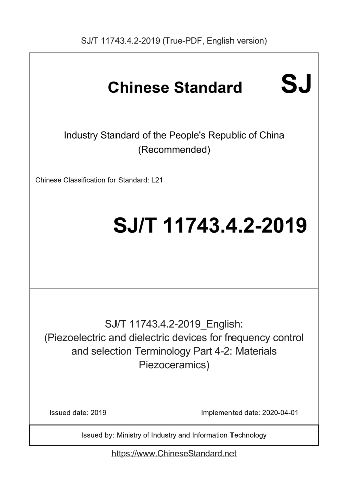 Delivery: <= 3 days. True-PDF full-copy in English will be manually translated and delivered via email. SJ/T 11743.4.2-2019: (Piezoelectric and dielectric devices for frequency control and selection Terminology Part 4-2: Materials Piezoceramics) Status: Valid