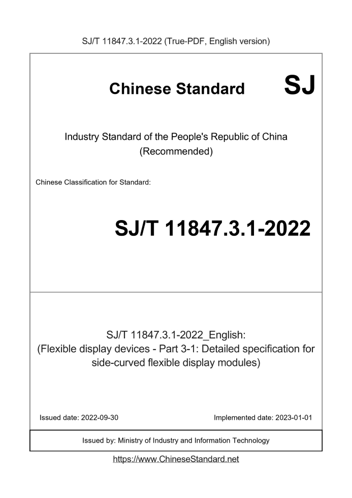 Basic dataStandard ID: SJ/T 11847.3.1-2022 (SJ/T11847.3.1-2022)Description (Translated English): (Flexible display devices - Part 3-1: Detailed specification for side-curved flexible display modules) Sector / Industry: Electronics Industry Standard (Recommended) Date of Issue: 2022-09-30 Date of Implementation: 2023-01-01 Issuing agency(ies): Ministry of Industry and Information Technology Summary: This standard specifies the terms and definitions, classification, technical requirements, inspection methods, inspection rules, as well as marking, packaging, transportation and storage requirements for side-bending flexible display devices. This standard applies to the development, production and delivery of side-bending flexible display modules using organic light-emitting diode display technology. Side-bending flexible display modules using other display technologies can be used as a reference. Tips & Frequently Asked Questions:Question 1: How long will the true-PDF of SJ/T 11847.3.1-2022_English be delivered?Answer: Upon your order, we will start to translate SJ/T 11847.3.1-2022_English as soon as possible, and keep you informed of the progress. The lead time is typically 1 ~ 3 working days. The lengthier the document the longer the lead time.Question 2: Can I share the purchased PDF of SJ/T 11847.3.1-2022_English with my colleagues?Answer: Yes. The purchased PDF of SJ/T 11847.3.1-2022_English will be deemed to be sold to your employer/organization who actually pays for it, including your colleagues and your employer's intranet.Question 3: Does the price include tax/VAT?Answer: Yes. Our tax invoice, downloaded/delivered in 9 seconds, includes all tax/VAT and complies with 100+ countries' tax regulations (tax exempted in 100+ countries) -- See Avoidance of Double Taxation Agreements (DTAs): List of DTAs signed between Singapore and 100+ countriesQuestion 4: Do you accept my currency other than USD?Answer: Yes. If you need your currency to be printed on the invoice, please write an email to Sales@ChineseStandard.net. In 2 working-hours, we will create a special link for you to pay in any currencies. Otherwise, follow the normal steps: Add to Cart -- Checkout -- Select your currency to pay. |