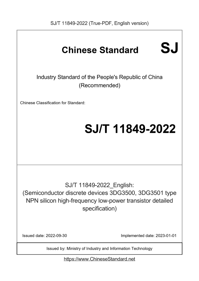 Delivery: <= 4 days. True-PDF full-copy in English will be manually translated and delivered via email. SJ/T 11849-2022: (Semiconductor discrete devices 3DG3500, 3DG3501 type NPN silicon high-frequency low-power transistor detailed specification) Status: Valid