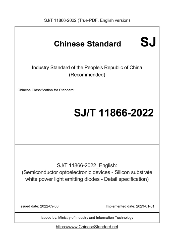 Delivery: <= 4 days. True-PDF full-copy in English will be manually translated and delivered via email. SJ/T 11866-2022: (Semiconductor optoelectronic devices - Silicon substrate white power light emitting diodes - Detail specification) Status: Valid