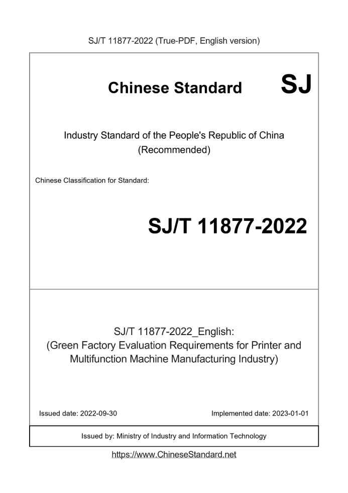 Delivery: <= 4 days. True-PDF full-copy in English will be manually translated and delivered via email. SJ/T 11877-2022: (Green Factory Evaluation Requirements for Printer and Multifunction Machine Manufacturing Industry) Status: Valid