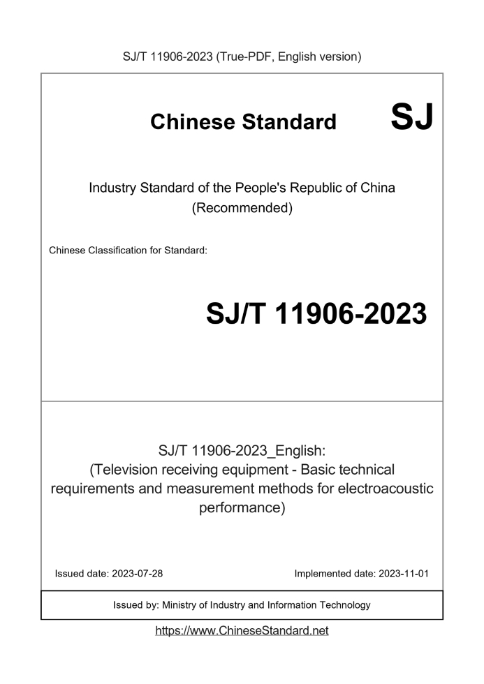 Basic dataStandard ID: SJ/T 11906-2023 (SJ/T11906-2023)Description (Translated English): (Television receiving equipment - Basic technical requirements and measurement methods for electroacoustic performance) Sector / Industry: Electronics Industry Standard (Recommended) Date of Issue: 2023-07-28 Date of Implementation: 2023-11-01 Issuing agency(ies): Ministry of Industry and Information Technology Summary: This standard specifies the basic technical requirements, measurement conditions and measurement methods for the electroacoustic performance of television receiving equipment using analog audio and digital audio input. This standard is suitable for testing the electroacoustic performance of television receiving equipment in analog audio and digital audio input. It is the main basis for product design, production finalization and inspection. Tips & Frequently Asked Questions:Question 1: How long will the true-PDF of SJ/T 11906-2023_English be delivered?Answer: Upon your order, we will start to translate SJ/T 11906-2023_English as soon as possible, and keep you informed of the progress. The lead time is typically 1 ~ 3 working days. The lengthier the document the longer the lead time.Question 2: Can I share the purchased PDF of SJ/T 11906-2023_English with my colleagues?Answer: Yes. The purchased PDF of SJ/T 11906-2023_English will be deemed to be sold to your employer/organization who actually pays for it, including your colleagues and your employer's intranet.Question 3: Does the price include tax/VAT?Answer: Yes. Our tax invoice, downloaded/delivered in 9 seconds, includes all tax/VAT and complies with 100+ countries' tax regulations (tax exempted in 100+ countries) -- See Avoidance of Double Taxation Agreements (DTAs): List of DTAs signed between Singapore and 100+ countriesQuestion 4: Do you accept my currency other than USD?Answer: Yes. If you need your currency to be printed on the invoice, please write an email to Sales@ChineseStandard.net. In 2 working-hours, we will create a special link for you to pay in any currencies. Otherwise, follow the normal steps: Add to Cart -- Checkout -- Select your currency to pay. |