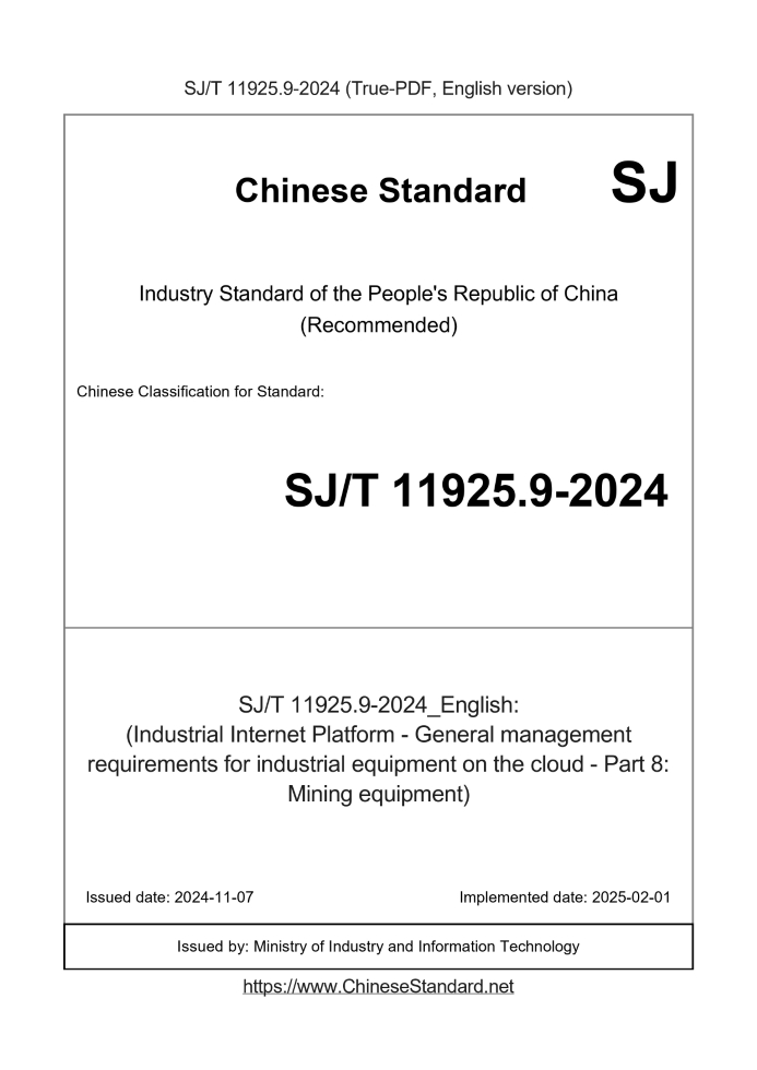 Delivery: <= 3 days. True-PDF full-copy in English will be manually translated and delivered via email. SJ/T 11925.9-2024: (Industrial Internet Platform - General management requirements for industrial equipment on the cloud - Part 8: Mining equipment) Status: Valid